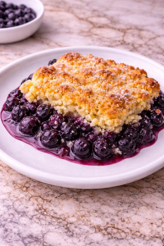 The blueberries release their natural juices while baking, soaking into the cake mix and creating a tender, jammy layer. The topping bakes into a slightly crisp, golden crust that contrasts beautifully with the soft interior. Each bite is a perfect balance of sweetness, fruitiness, and buttery richness.