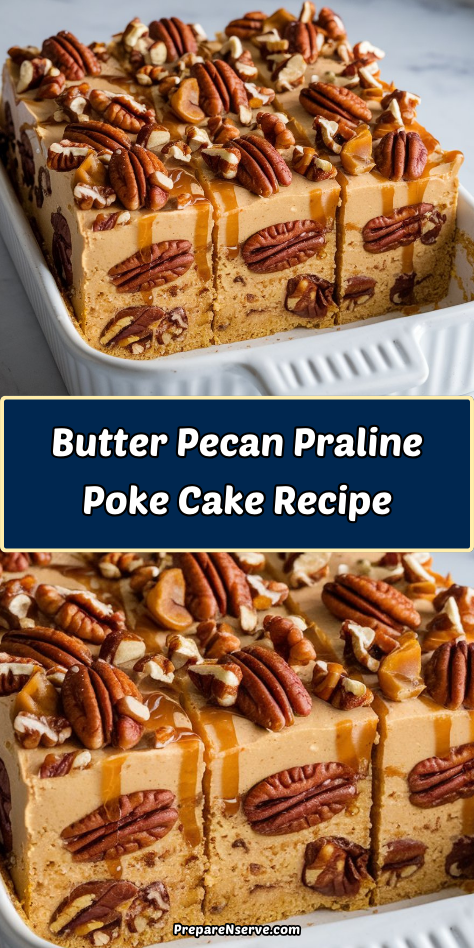 This Butter Pecan Praline Poke Cake stands as a tribute to dessert perfection with its harmonious blend of buttery cake, rich caramel, and crunchy pecans.