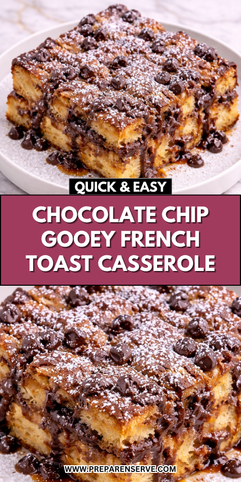 Chocolate chip gooey French toast casserole is perfect for preparing ahead, which makes it ideal for busy mornings or special occasions. After assembling the casserole, cover it tightly with plastic wrap or foil and refrigerate overnight. This allows the bread to fully absorb the custard and helps the flavors come together.