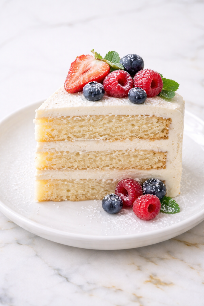 Serve classic vanilla cake with fresh berries for a light and refreshing contrast. Strawberries or raspberries work especially well. The fruit balances the sweetness.