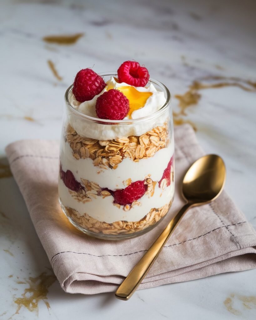 The crunchy oats mixed with fluffy whipped cream, honey, and juicy raspberries create these incredible layers of texture and flavor!