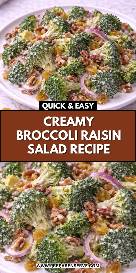 Creamy broccoli raisin salad is an excellent dish to prepare ahead of time because the flavors improve as they sit. The dressing softens the raisins slightly while coating the broccoli, creating a more balanced bite.