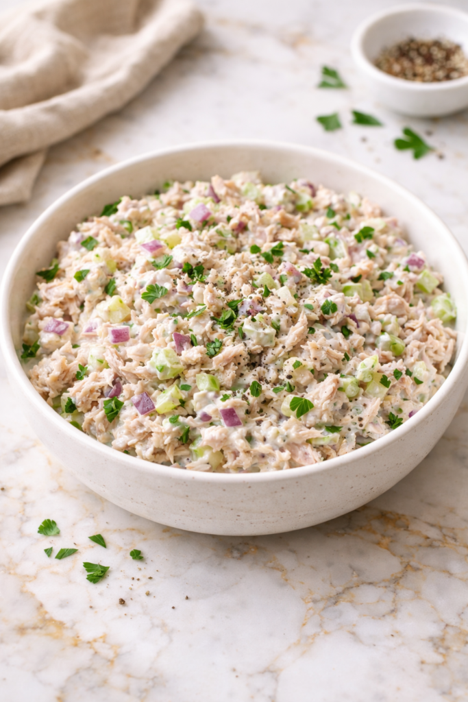 Avoid overmixing so the tuna keeps its texture. The salad should be creamy but still slightly chunky.
