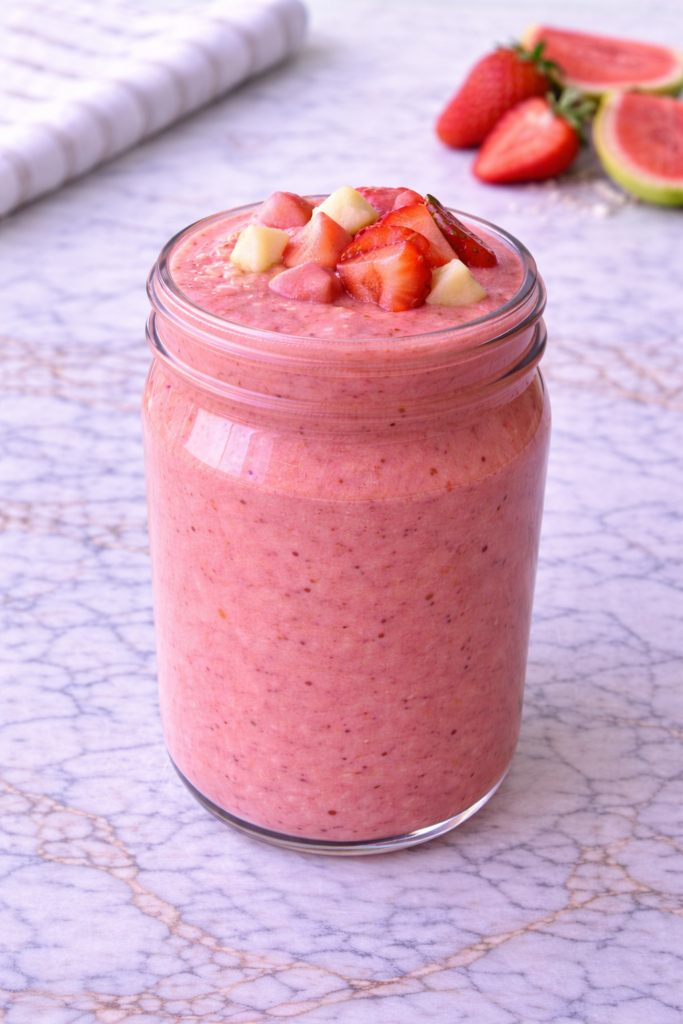 This smoothie has a soft, fruity flavor that feels refreshing and comforting at the same time. The guava adds a gentle tropical note, while strawberries bring brightness without too much sweetness. The result is smooth, balanced, and easy to enjoy.