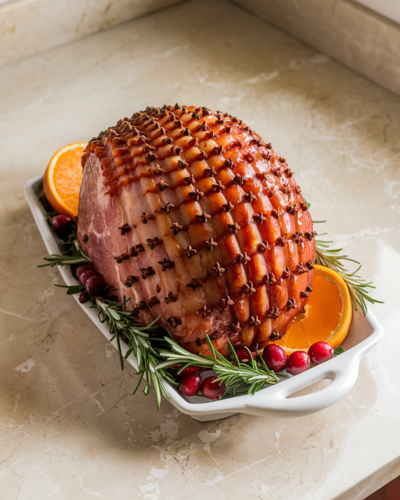 Let ham rest for 10–15 minutes before slicing. Garnish with oranges, rosemary, or cranberries.