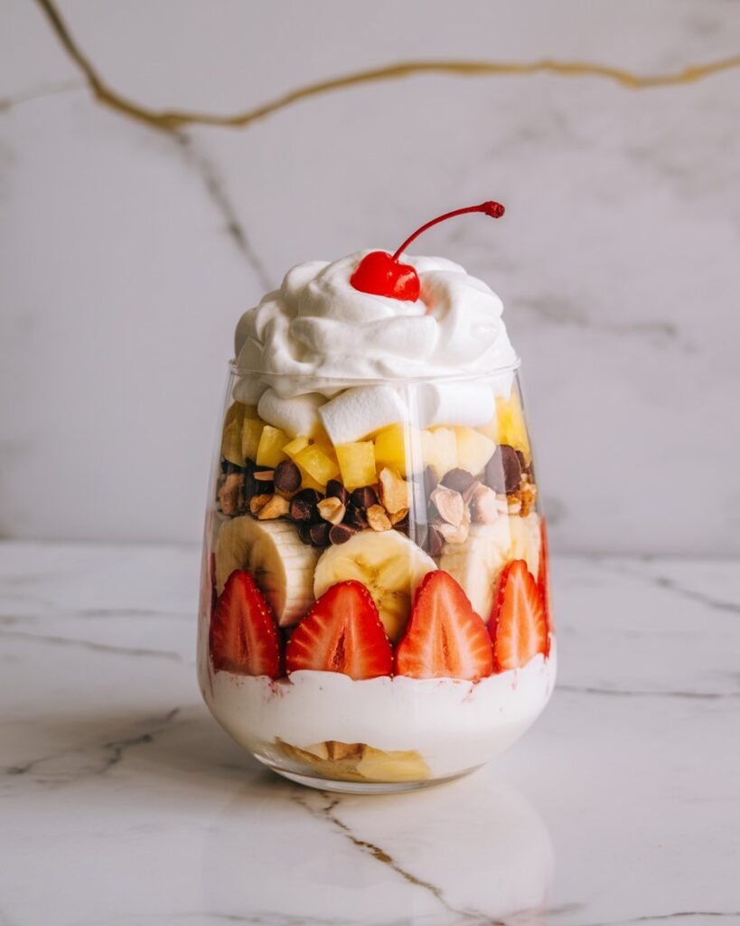 It’s got everything you love about a classic banana split—fresh bananas, pineapple, cherries, and chocolate—transformed into a creamy, nostalgic treat that’s perfect for backyard gatherings or just because it’s Tuesday.